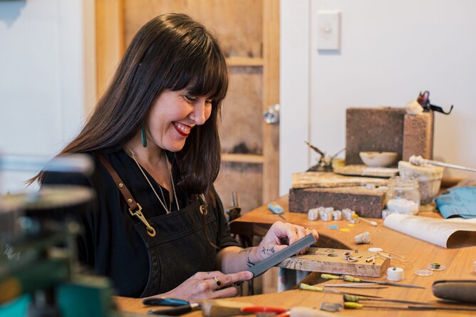 Courtney Jamieson (Tainui, Ngāti Koroki Kahukura) is a jeweller, artist and a lapidist – someone who cuts and shapes precious stones.